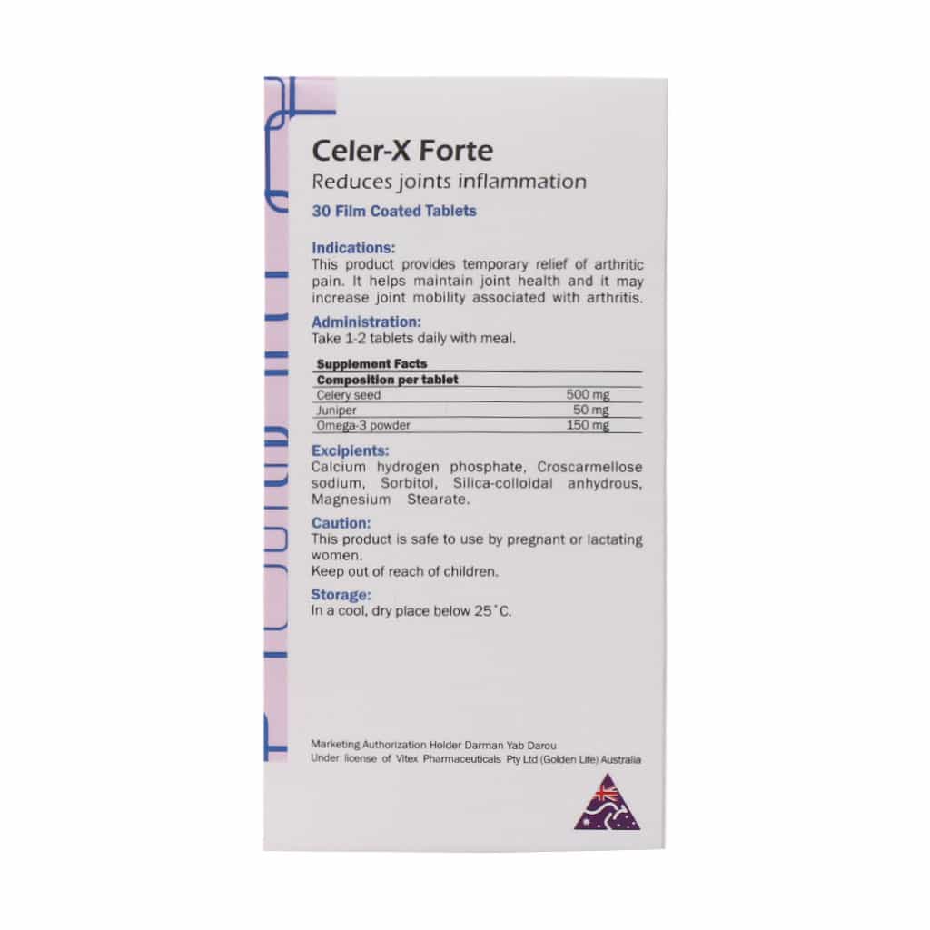 قرص روکشدار سلرکس فورت گلدن لایف تحرک و انعطاف پذیری مفاصل را افزایش داده و موجب کاهش التهاب و دردهای ناشی از آن میشود. این مکمل حاوی عصاره سلری، جونیپر و امگا 3 است که کاهش دردهای روماتیسمی و نقرس را به دنبال دارد. عصاره سلری دارای خاصیت ضد روماتیسم، آرام بخش، مدر و ضدعفونی کننده مجاری ادرار است و جهت درمان آرتریت، روماتیسم، نقرس و به خصوص روماتیسم مفصلی همراه با افسردگی استفاده میشود. عصاره جونیپر نیز خواص ضد التهاب، ضد نفخ و ضد روماتیسم دارد. در نهایت اسید چرب امگا 3 به کار رفته در قرص ضد درد مفاصل با مهار مسیرهای تولید کننده التهاب مانع از ایجاد التهاب و درد خواهد شد.