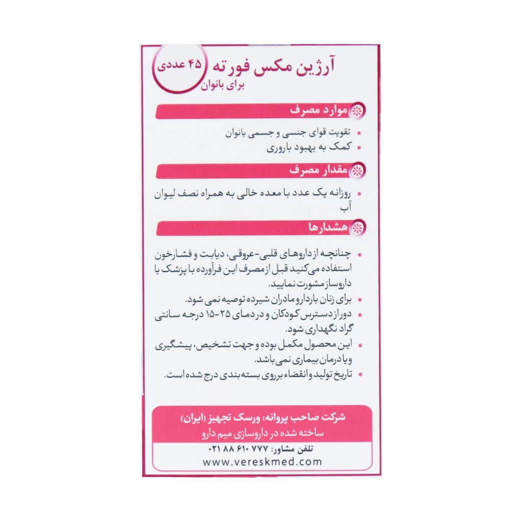 کپسول آرژين مکس فورته مخصوص بانوان 45 عدد /Veresk Arginmax Forte For Women 45 Caps