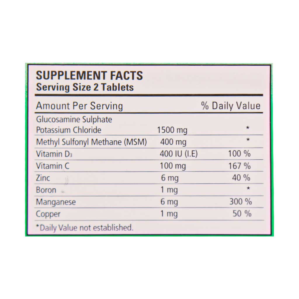 - حاوی گلوکزامین، ام اس ام، ویتامینهای D3 و C، روی، بور، منگنز و مس