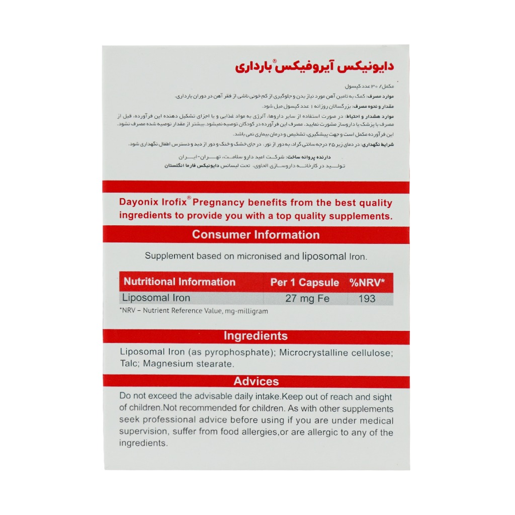 کپسول آیروفیکس بارداری دایونیکس فارما یک مکمل آهن پیشرفته و ویژه برای بانوان باردار است که به شکل کپسول و در بسته‌های 30 عددی عرضه می‌شود. این محصول حاوی 27 میلی گرم آهن لیپوزومال است که به تامین آهن مورد نیاز بدن، پیشگیری و درمان کم خونی ناشی از فقر آهن کمک می‌کند و از عوارضی مانند خستگی، ضعف و کاهش اکسیژن رسانی به بدن مادر و جنین جلوگیری می‌کند. فرم آهن موجود در این مکمل به صورت لیپوزومال بوده که هم به افزایش جذب آهن کمک کرده و هم عوارض گوارشی را به حداقل رسانده است. این مکمل تحت لیسانس شرکت دایونیکس فارما انگلستان و در کارخانه داروسازی الحاوی در ایران تولید و بسته بندی می‌شود.