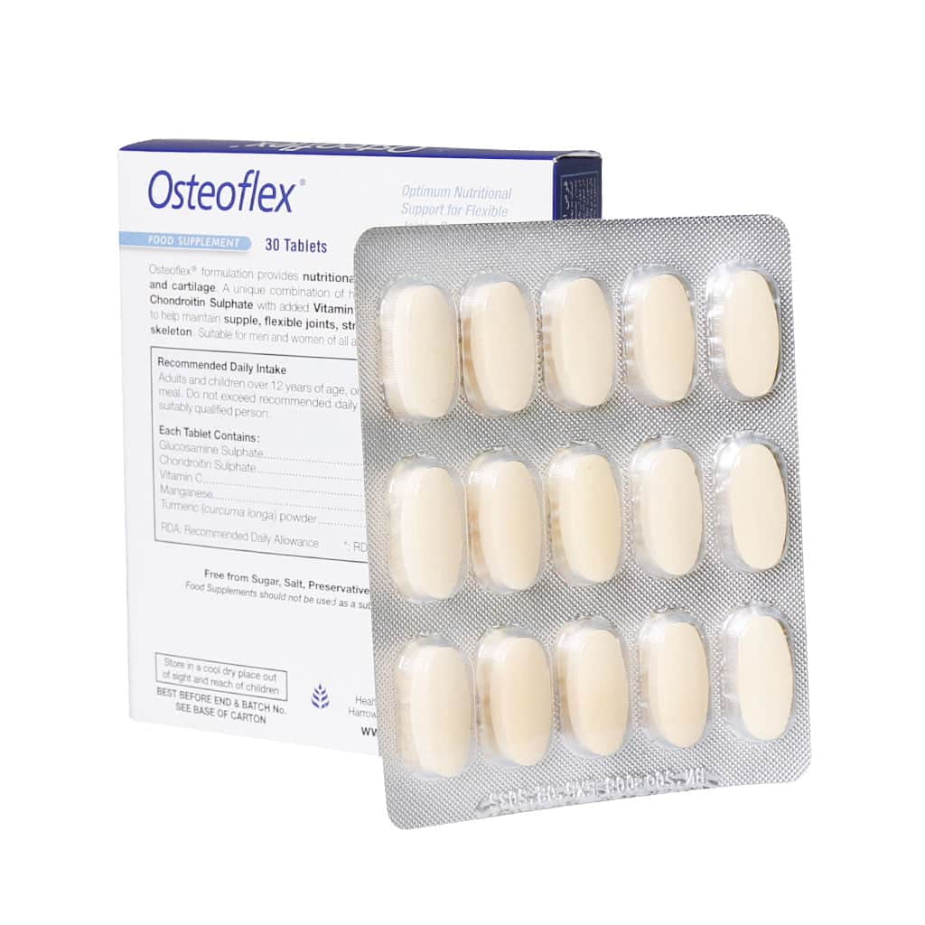 قرص استئوفلکس هلث اید ترکیبی ممتاز و ویژه حاوی گلوکزآمین، کندروئیتین، ویتامین C، منگنز و زردچوبه است. این محصول برای کمک به حفظ نرمی و انعظاف پذیری مفاصل، تقویت و بازسازی غضروف‌های آسیب دیده و سلامت استخوان‌ها فرموله شده است. این فراورده دارویی به صورت آهسته رهش تهیه شده است، به طوری که این ترکیب در مدت زمان طولانی‌تر در دستگاه گوارش باز می‌شود و به این ترتیب عوارض گوارشی ناشی از ترکیبات آن به خصوص گلوکزآمین به حداقل می‌رسد.