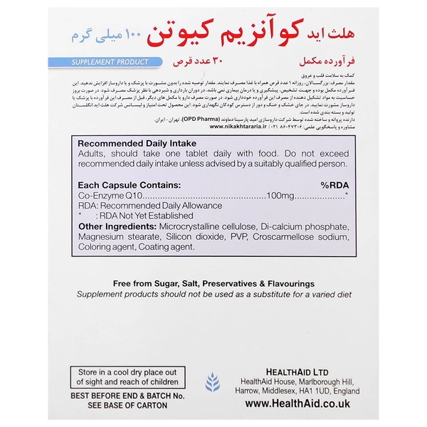 کوآنزیم کیوتن 100 میلیگرم هلث اید تحت لیسانس شرکت HealthAid انگلستان و با پروانه شرکت داروسازی امید پارسینا دماوند در ایران به تولید میرسد و در بستهبندی حاوی ۳۰ قرص در دسترس مصرفکنندگان قرار دارد.